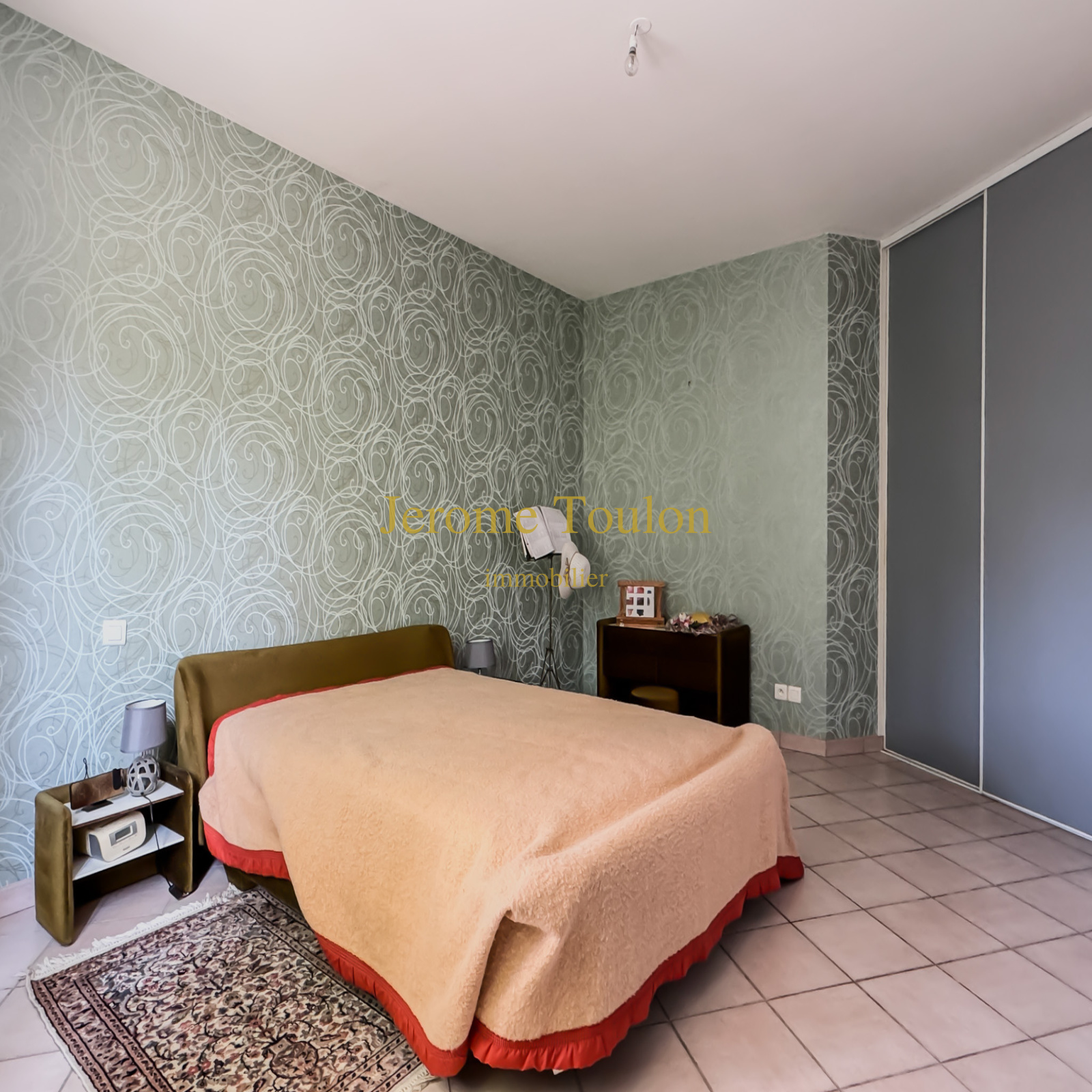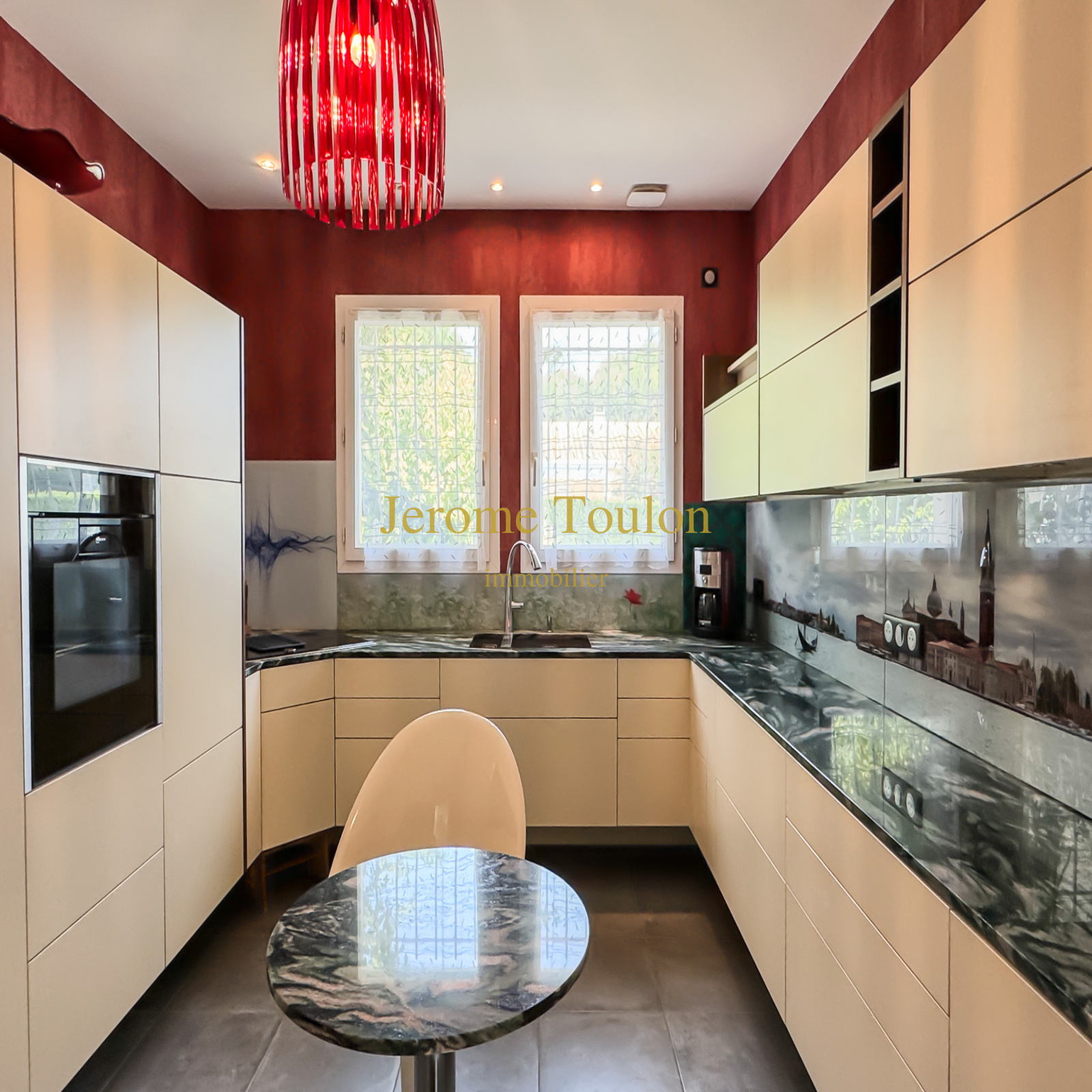 Vous découvrirez un hall d'entrée, un spacieux séjour très lumineux ouvrant sur une terrasse avec stores, un coin salle à manger, une cuisine indépendante équipée et aménagée avec un élégant plan de travail en marbre vert, un dégagement desservant deux chambres, une salle d'eau et un wc indépendant.