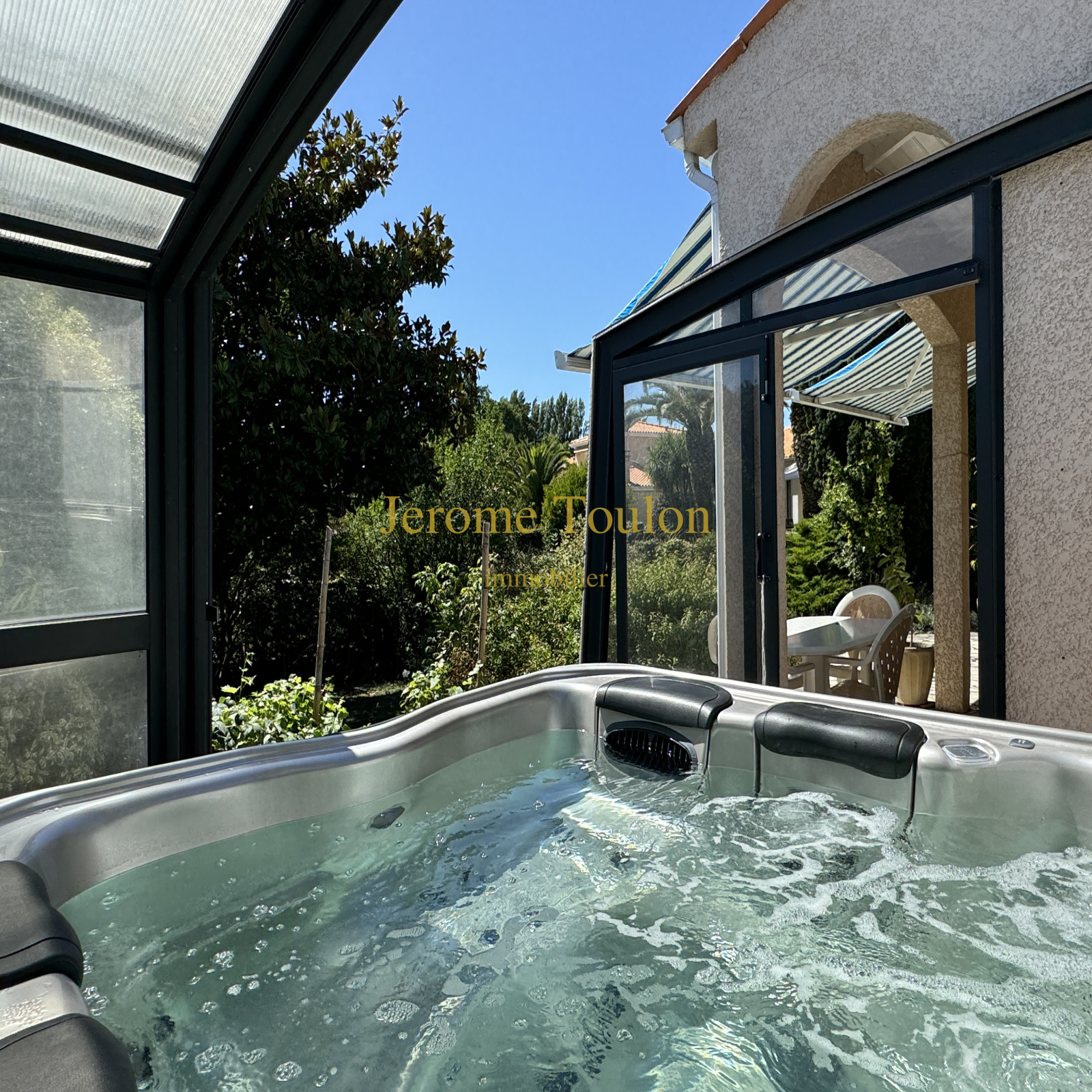 À l’extérieur, son jardin de 640 m² implanté en 1ère ligne sur le lac et exposé plein Sud constitue un véritable havre de paix. Le spa, baigné de lumière dans cette véranda, invite à la détente toute l'année.