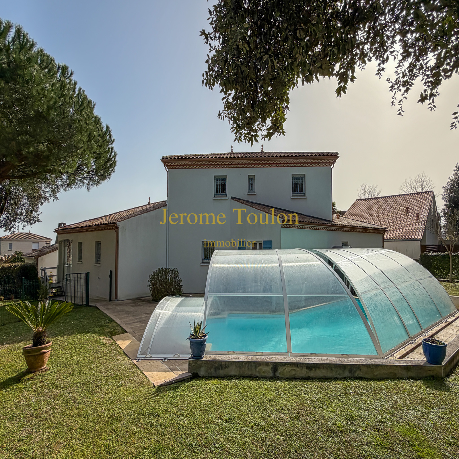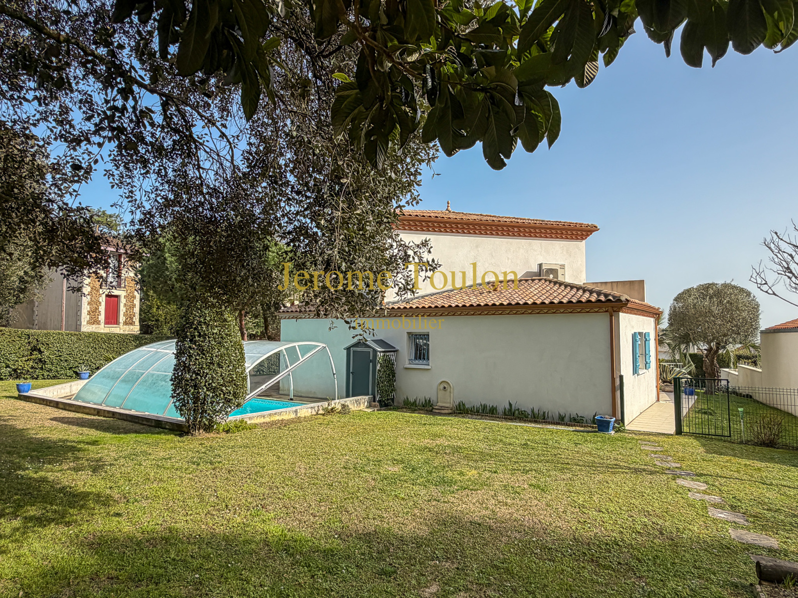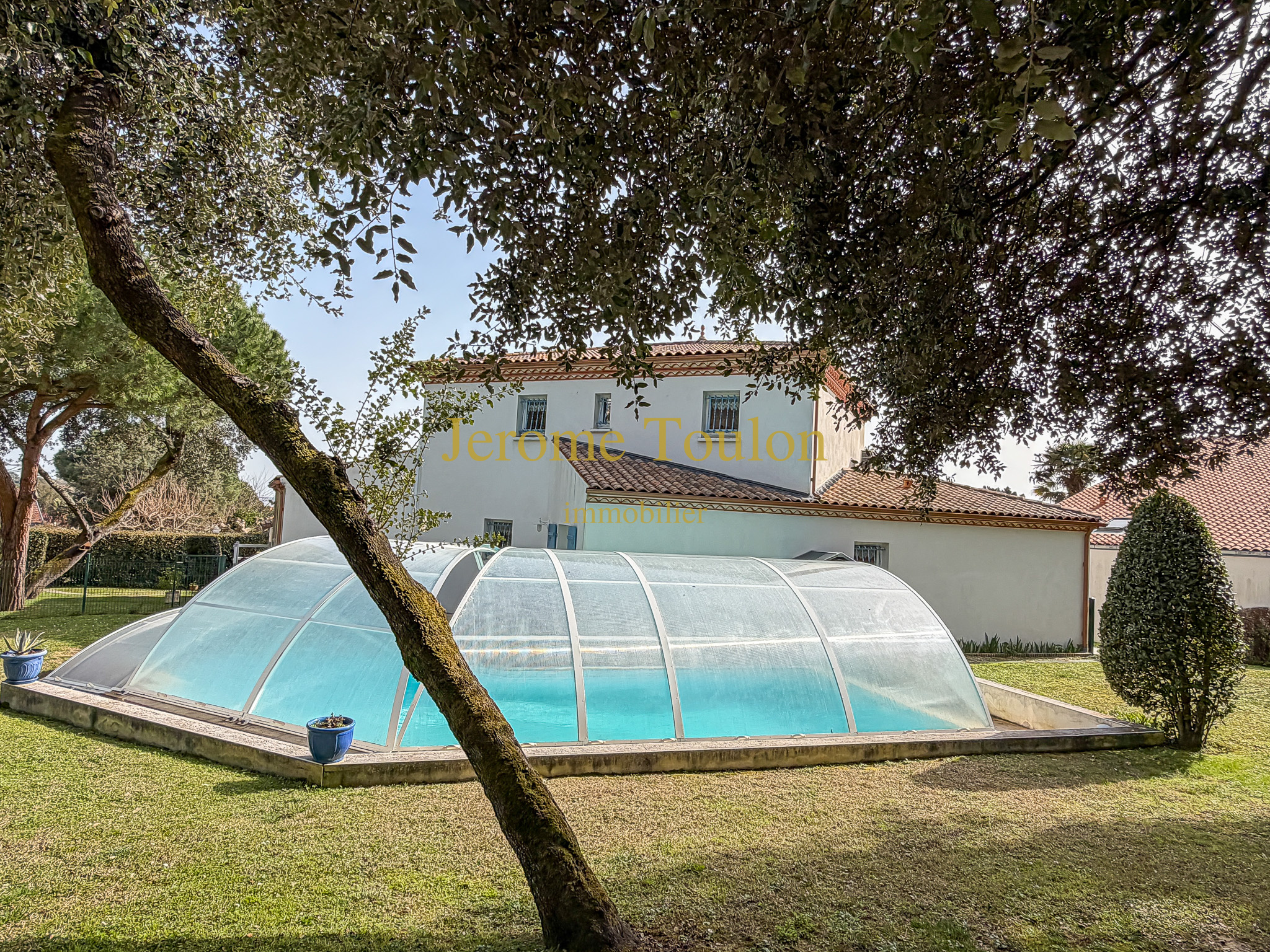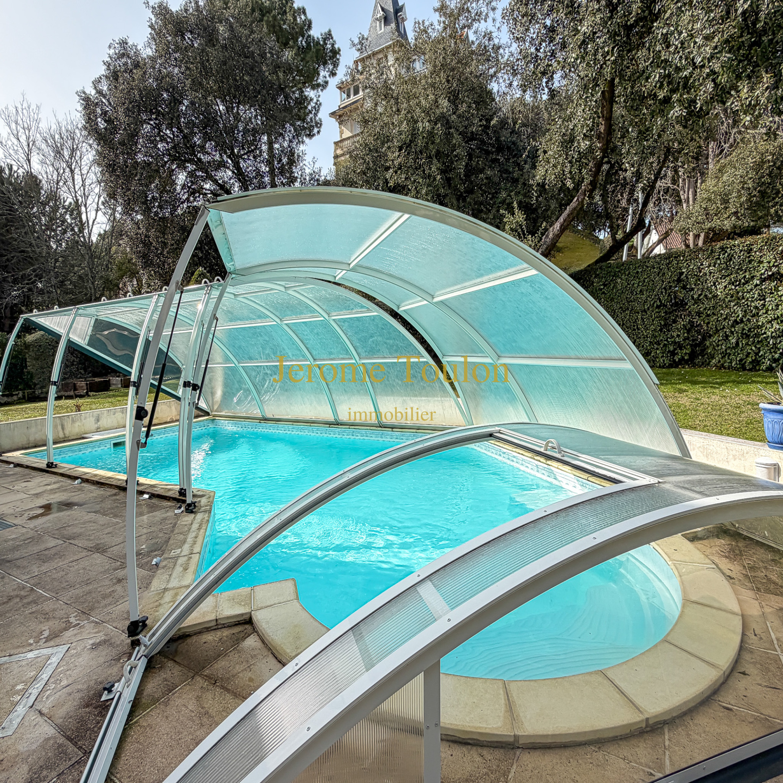À l’extérieur, le jardin clos de 1205 m² soigneusement aménagé accueille une piscine couverte à la forme originale et une belle terrasse agrémentée de stores.