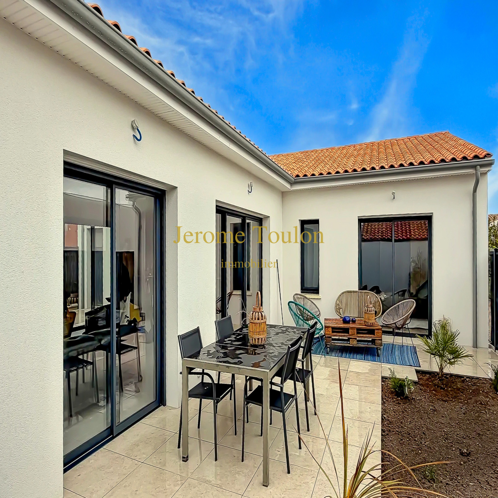 Jérôme Toulon Immobilier vous présente une magnifique villa neuve de 116 m² habitables, entièrement de plain-pied et située dans un quartier calme et habité, à 1km500 des plages et du centre-ville.
