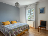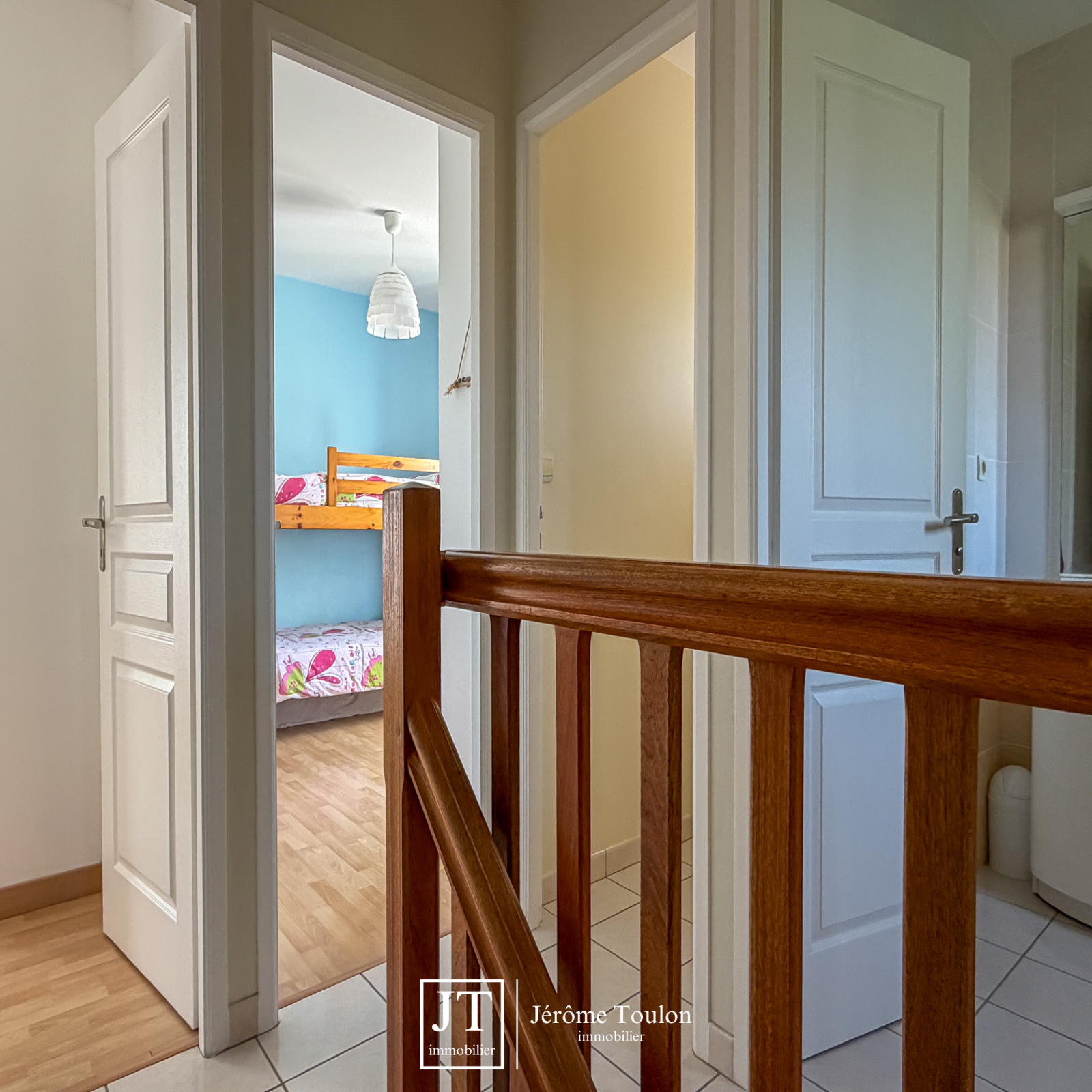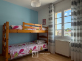 À l'étage, nous poursuivons avec un palier desservant 3 chambres avec chacune son placard, une salle de bains avec deux vasques et un wc indépendant.