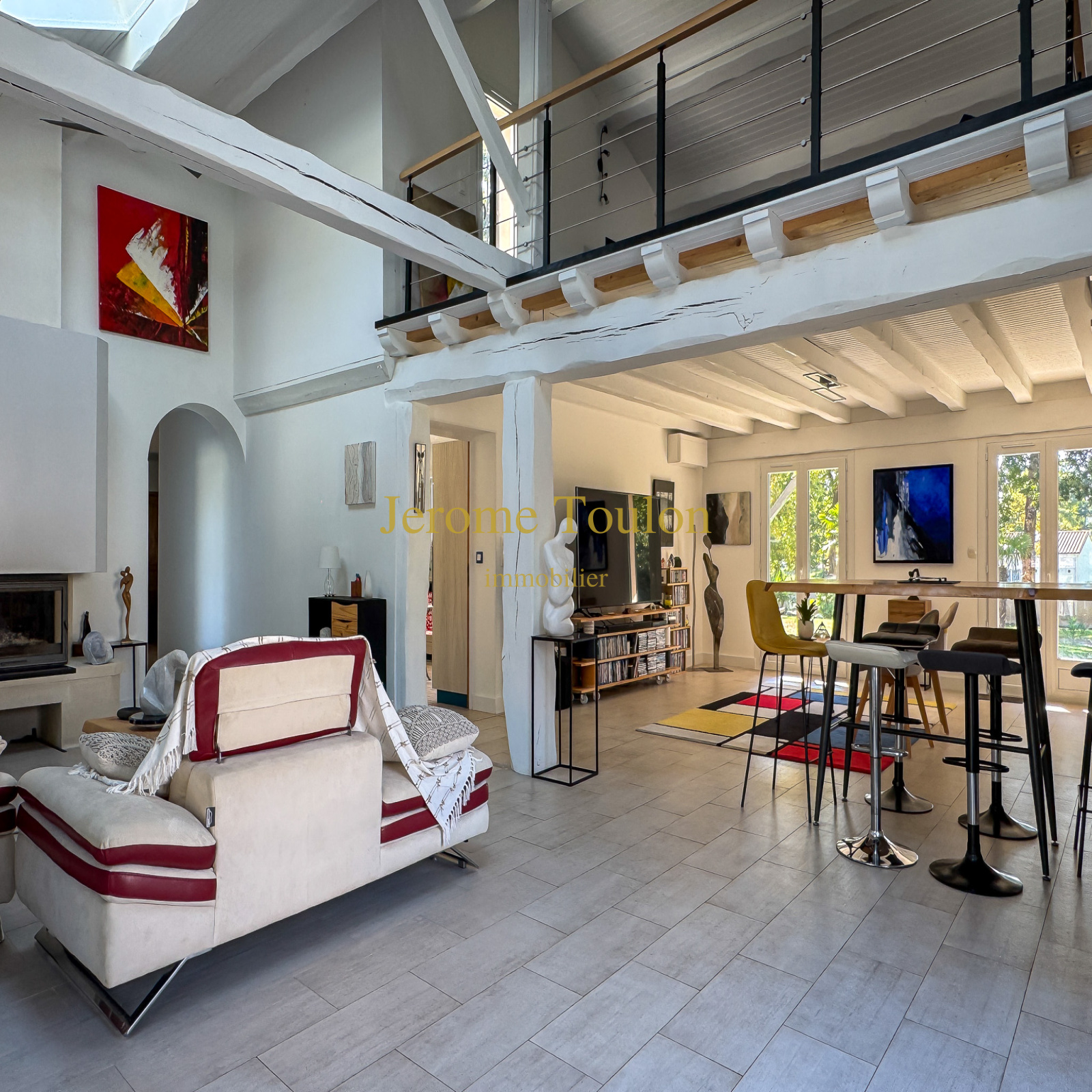 À l'étage, on retrouve une spacieuse mezzanine ouvrant sur le patio et communiquant sur l'autre partie de la maison pour découvrir un bureau, une chambre et une salle d'eau avec un wc.