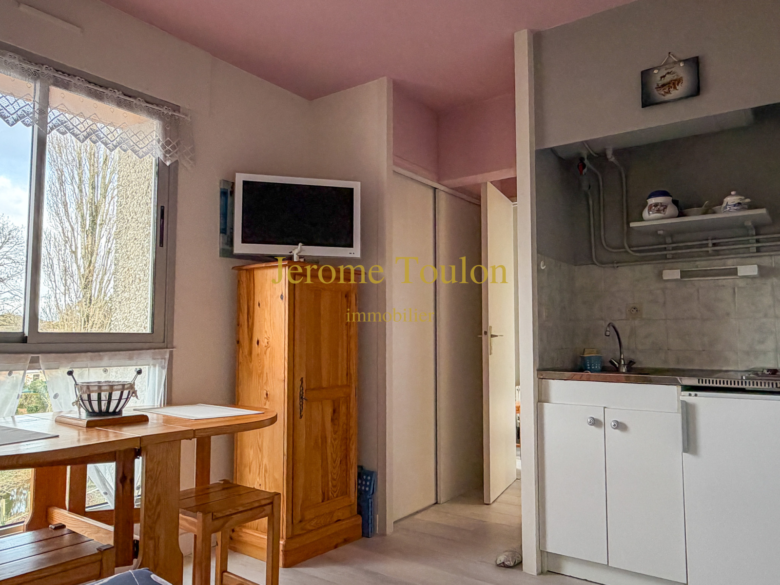 Vous découvrirez, un séjour avec une cuisine ouverte, un dégagement avec placard, une chambre et une salle d'eau avec un wc.