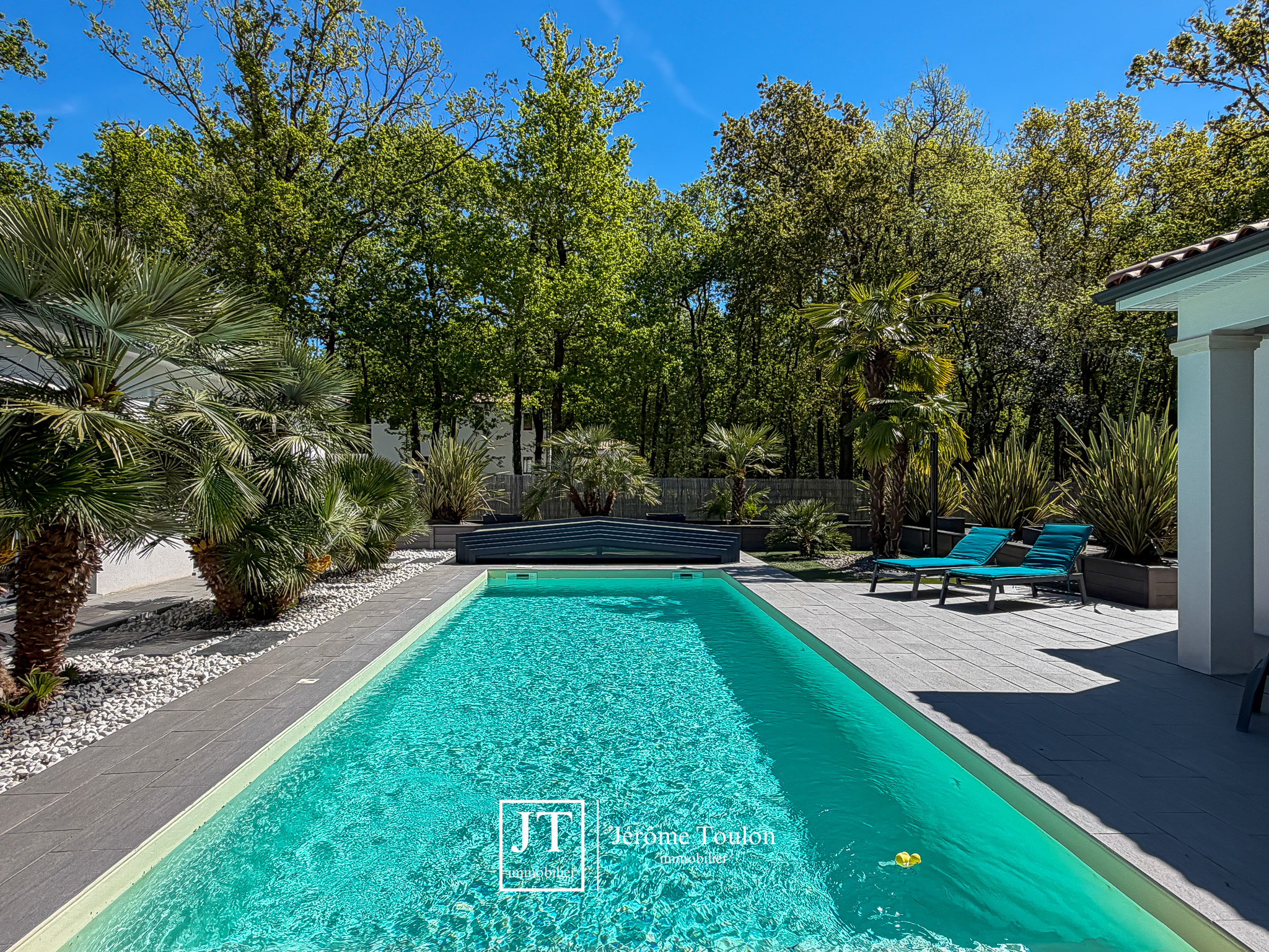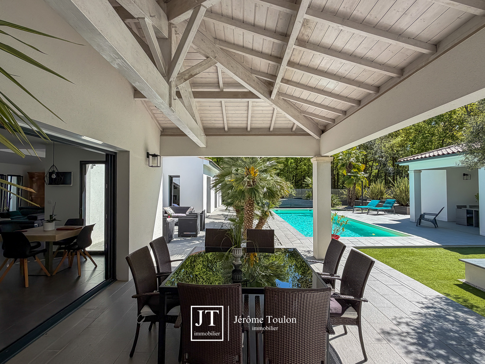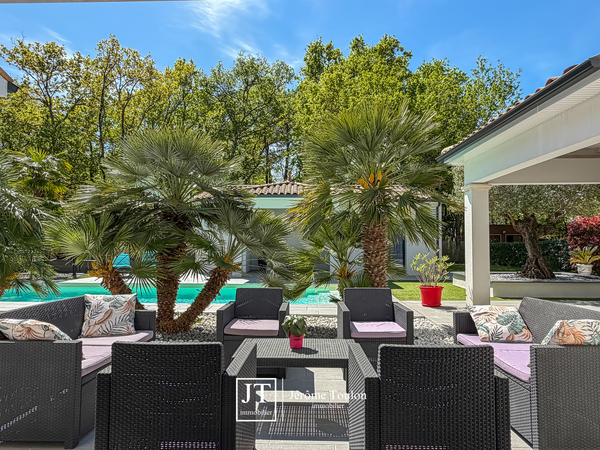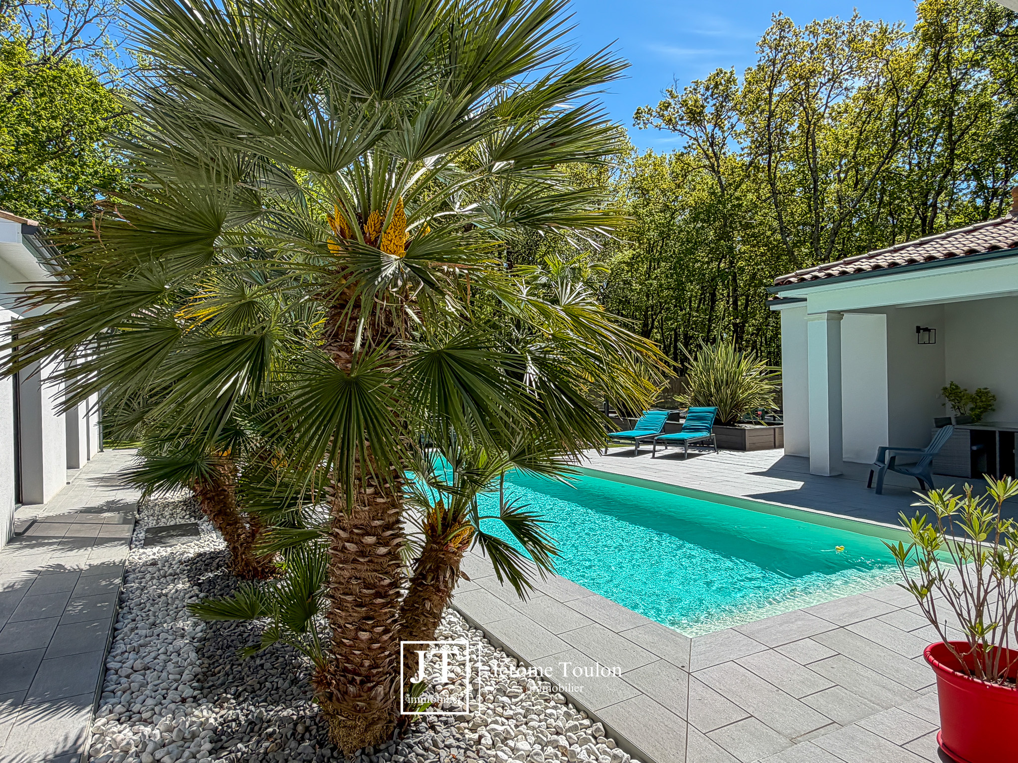 À l’extérieur, tout a été pensé pour profiter pleinement du cadre de vie. La propriété dispose d’une piscine de 10 x 3,50 m traitée au sel avec un abri bas, de plusieurs terrasses, dont deux couvertes. Le jardin paysager aux essences méditerranéennes, soigneusement entretenu, s’accompagne également d’un boulodrome et d'un abri de jardin sur 1660 m².