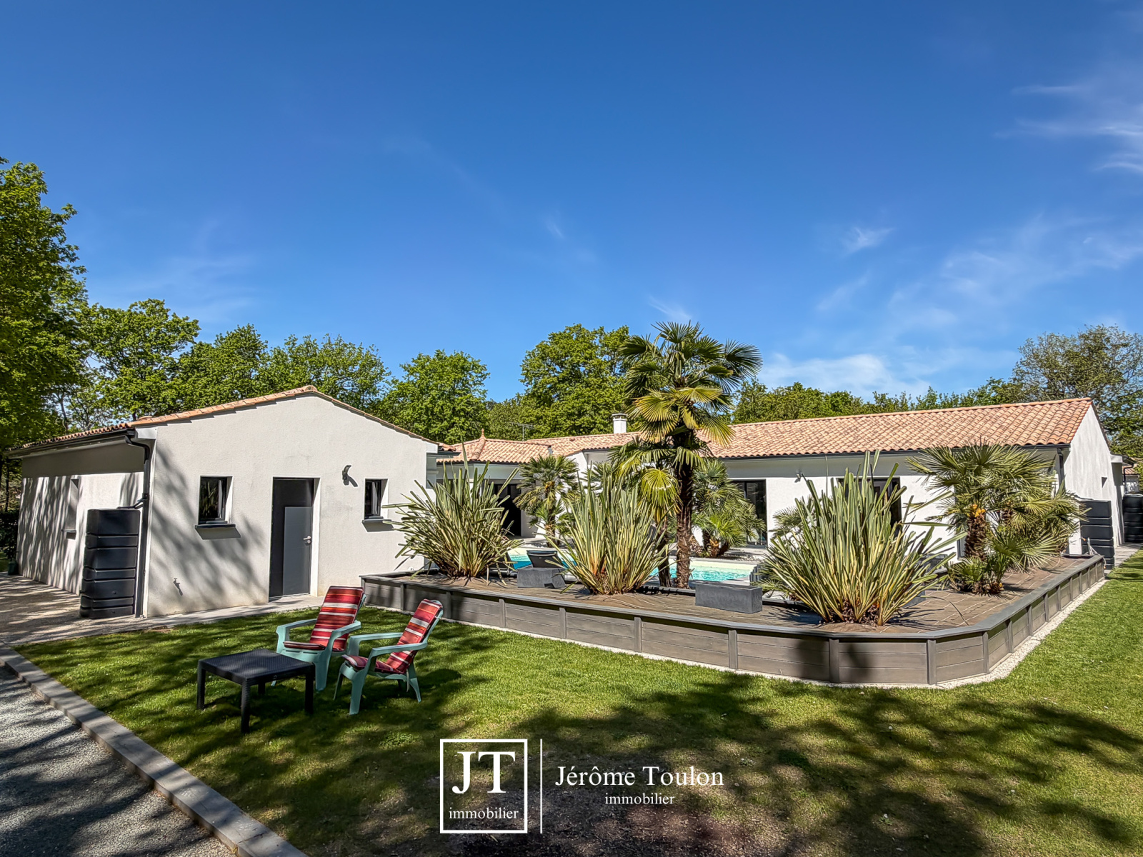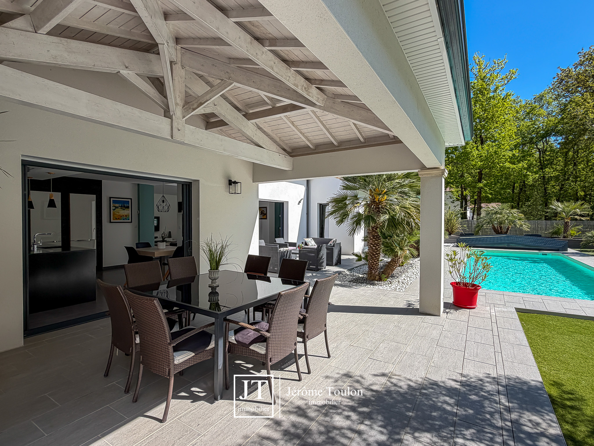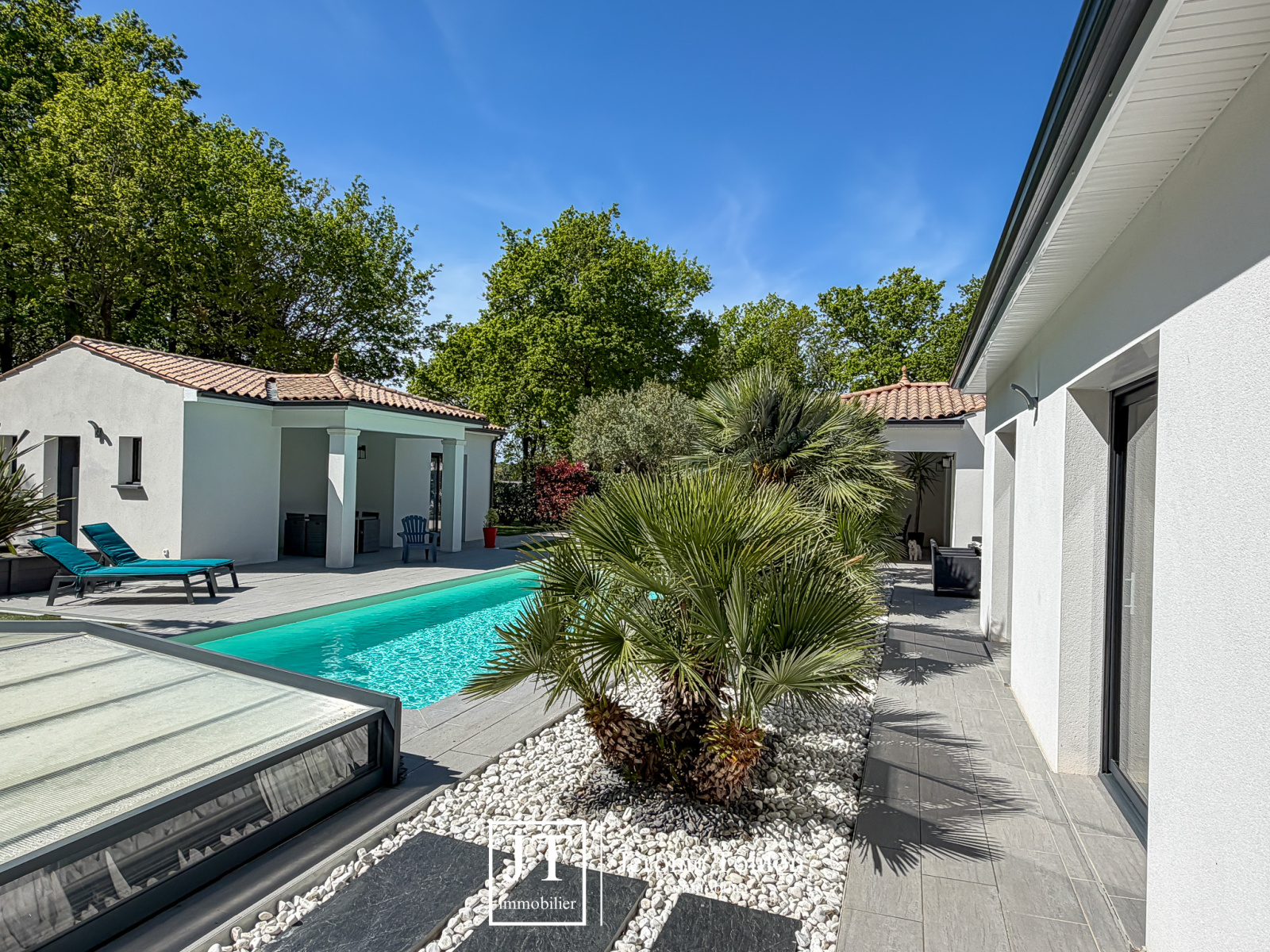 À l’extérieur, tout a été pensé pour profiter pleinement du cadre de vie. La propriété dispose d’une piscine de 10 x 3,50 m traitée au sel avec un abri bas, de plusieurs terrasses, dont deux couvertes. Le jardin paysager aux essences méditerranéennes, soigneusement entretenu, s’accompagne également d’un boulodrome et d'un abri de jardin sur 1660 m².