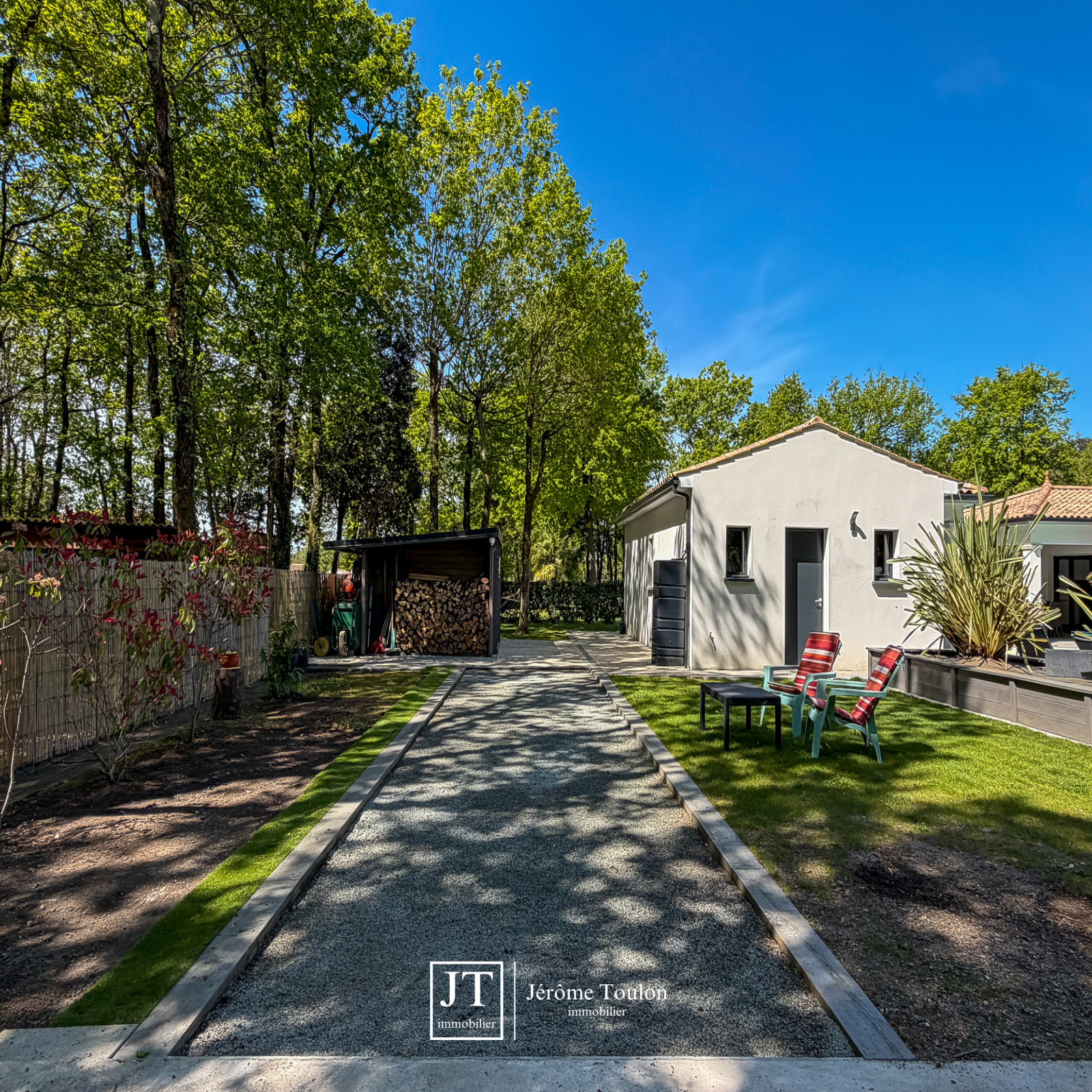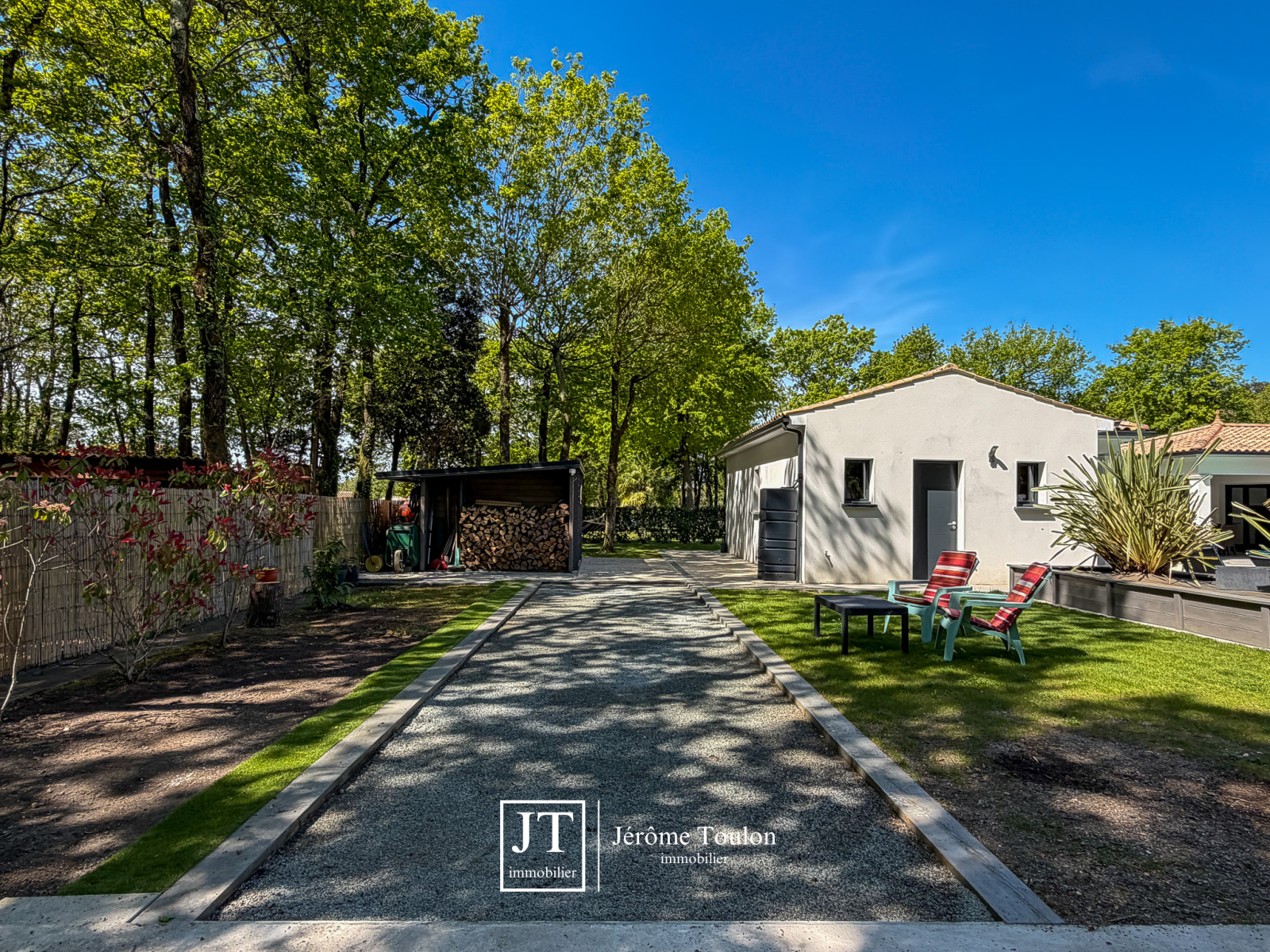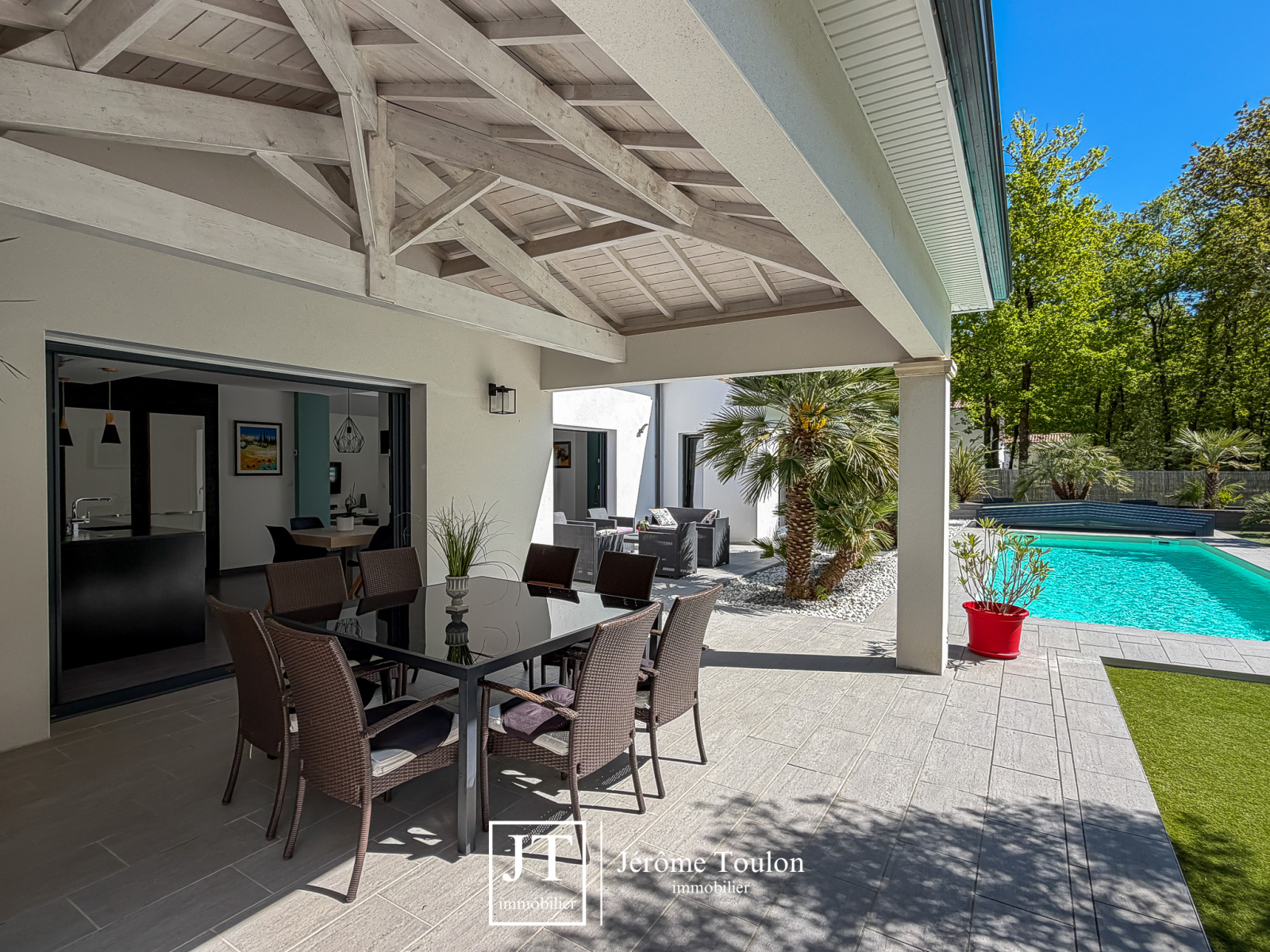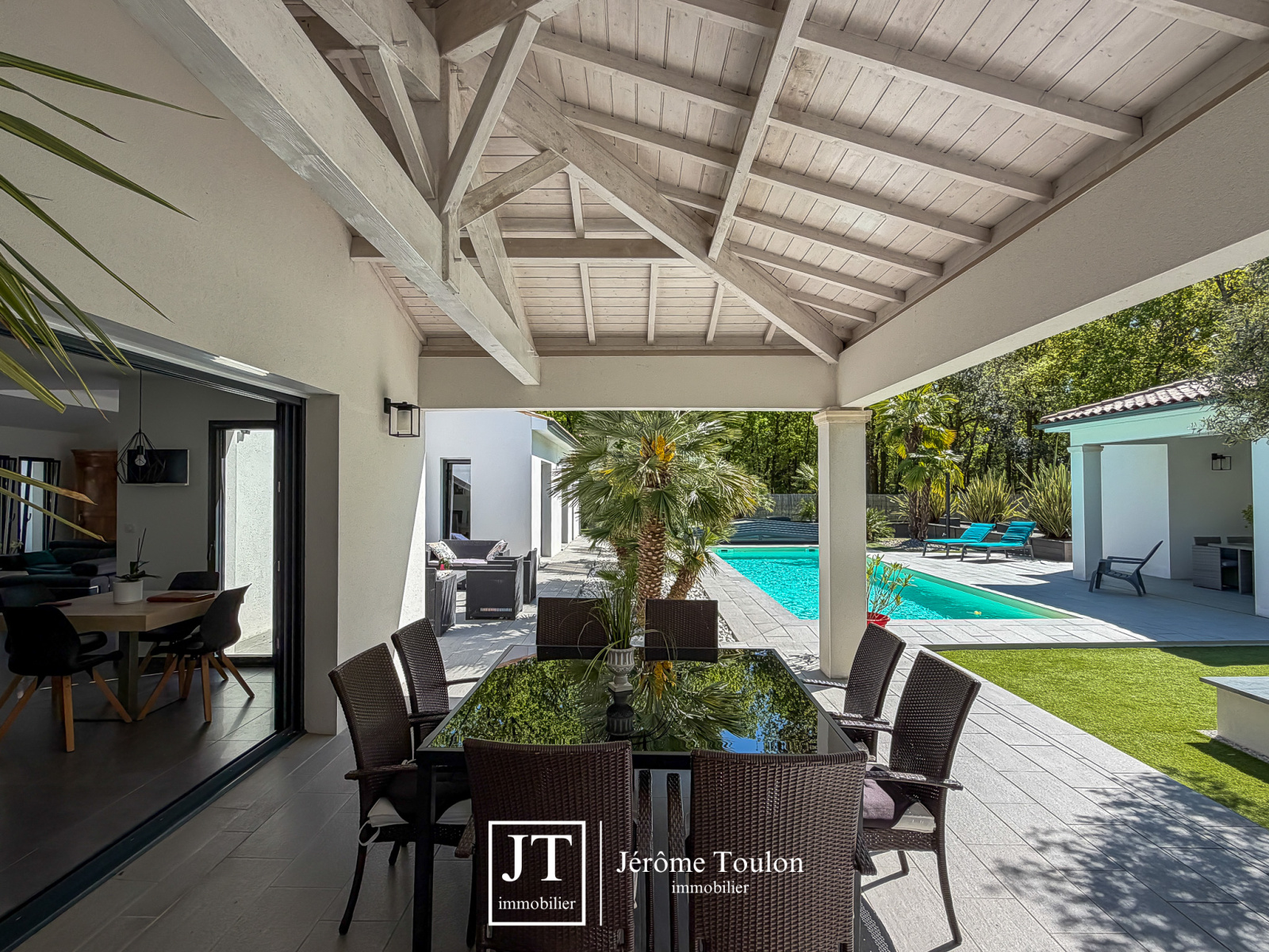 À l’extérieur, tout a été pensé pour profiter pleinement du cadre de vie. La propriété dispose d’une piscine de 10 x 3,50 m traitée au sel avec un abri bas, de plusieurs terrasses, dont deux couvertes. Le jardin paysager aux essences méditerranéennes, soigneusement entretenu, s’accompagne également d’un boulodrome et d'un abri de jardin sur 1660 m².